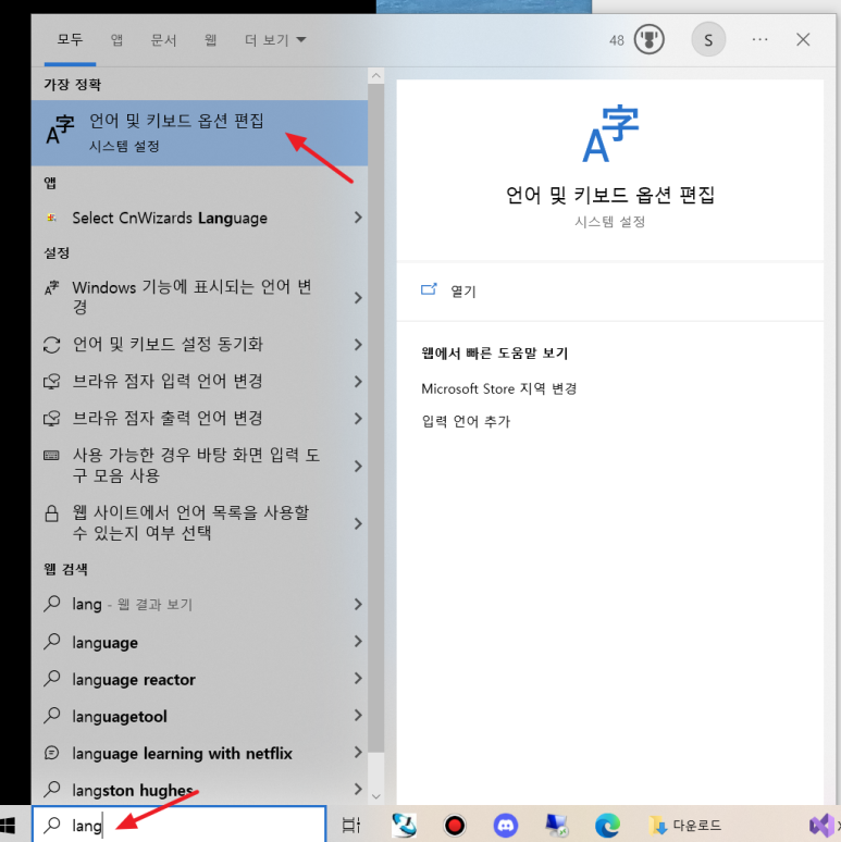 1. 윈도우 아래쪽 찾기에서 "lang" 입력 후 나오는 검색 목록에서