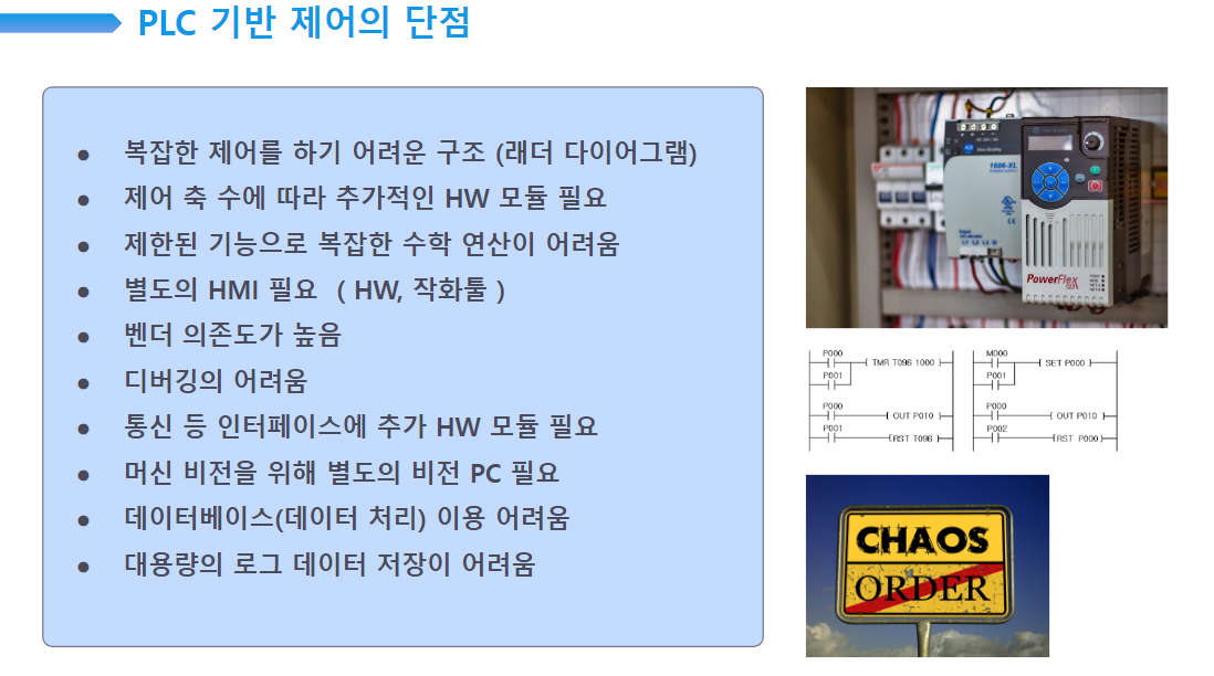 PLC는 오랫동안 자동화 장비 제어를 위해 사용되어 왔고 , 지금도 산업 현장에서 가장 많이 사용하는 자동화 장비 제어기이지만 전통적인 PLC 제어기나 개발 방식은 몇가지 단점이 있는 것도 사실이다.